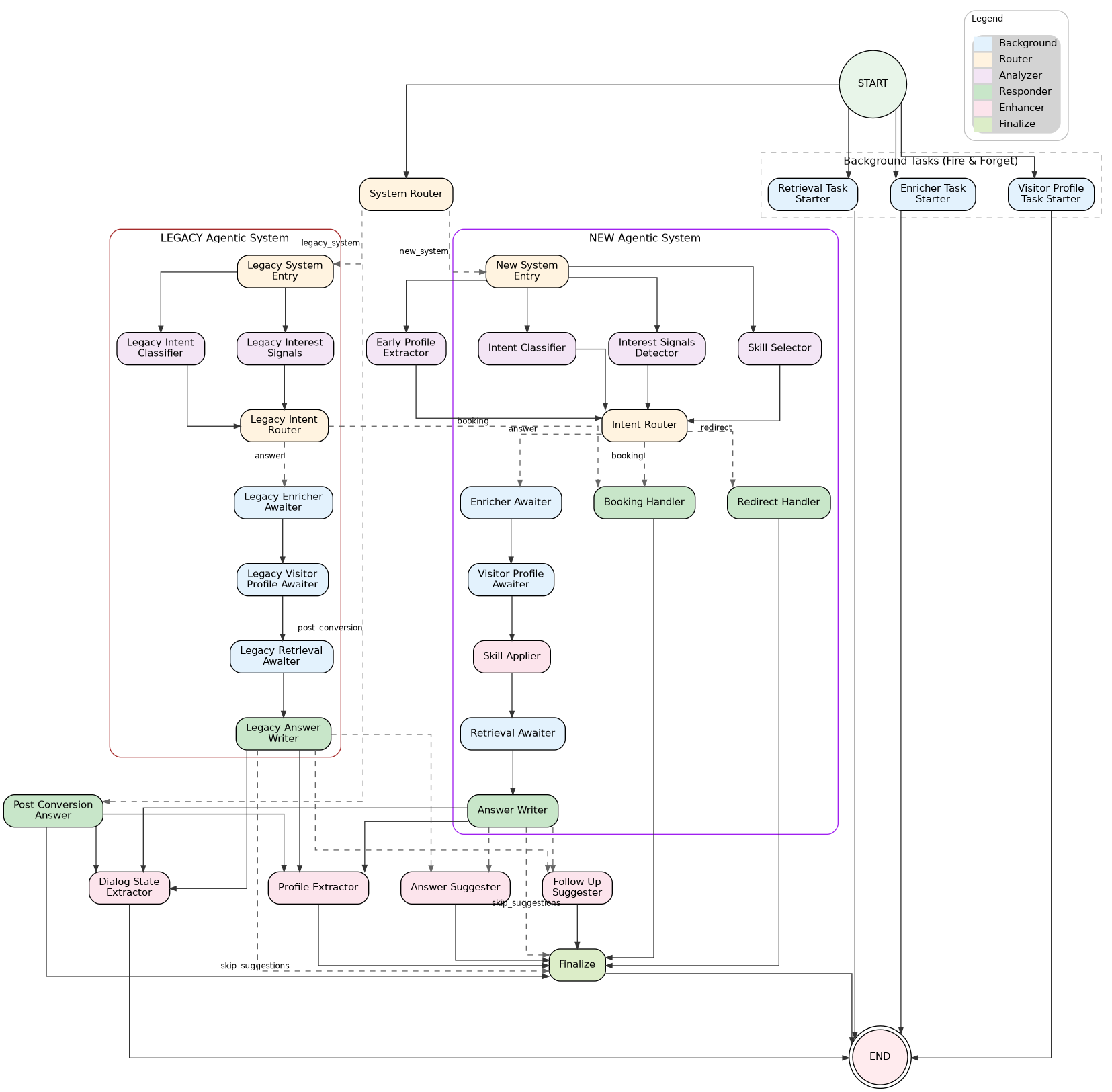 | LEGACY | Production (default) | 2-way routing (ANSWER/BOOKING) via legacy_intent_router |